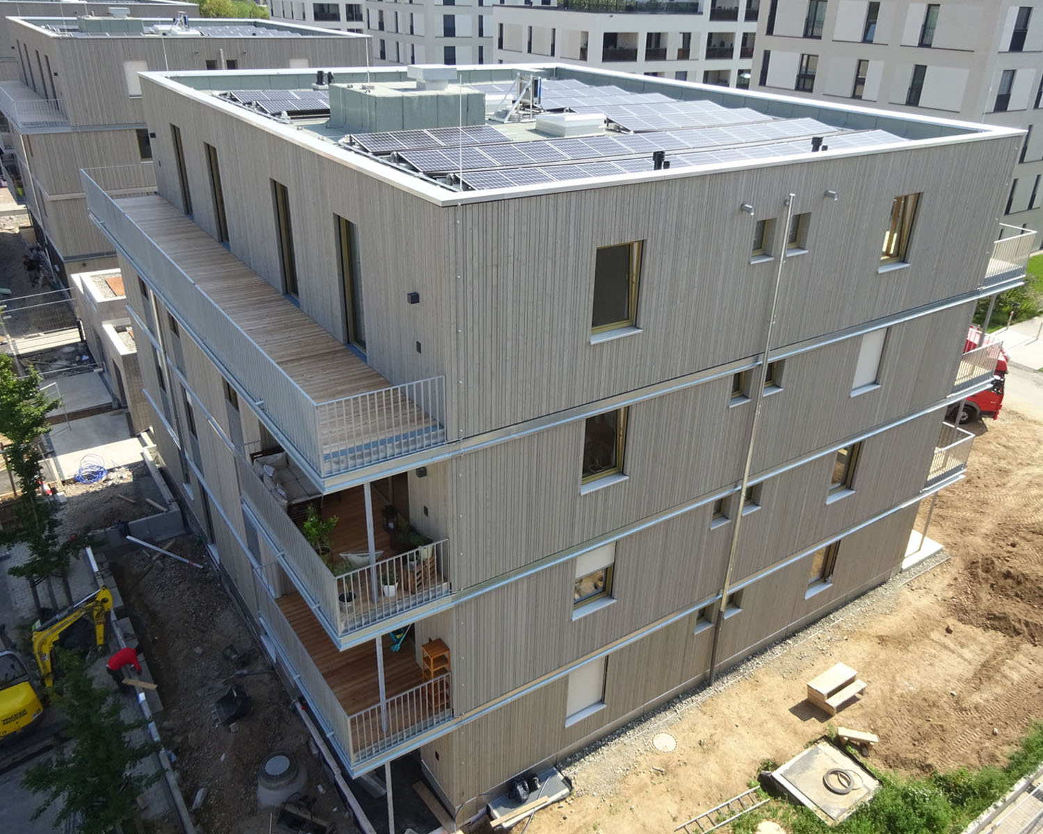 - Erstellen einer hinterlüfteten Holzfassade aus Nadelholz, an vier Stück vierstöckigen Mehrfamilienhäuser in Holzrahmenbauweise – Gesamtfläche ca. 2800 m²